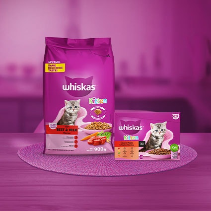 WHISKAS® dry kibbles come in tiny, bite sizes, that easily fit into the small mouth of your furry baby. And, the wet food for cat has a jelly-like texture that kittens not only find easy to eat, but are extremely tasty as well.